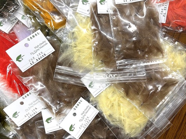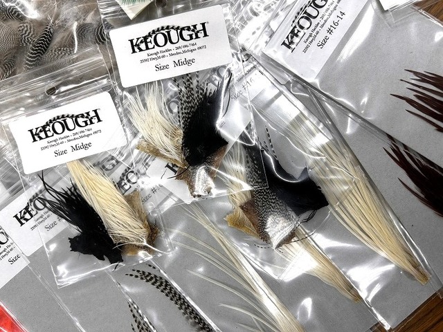 ドライフライ用コックハックル小袋パック、良く使われる14~16サイズ各色と、ミッジサイズカラーアソートを仕入れています。