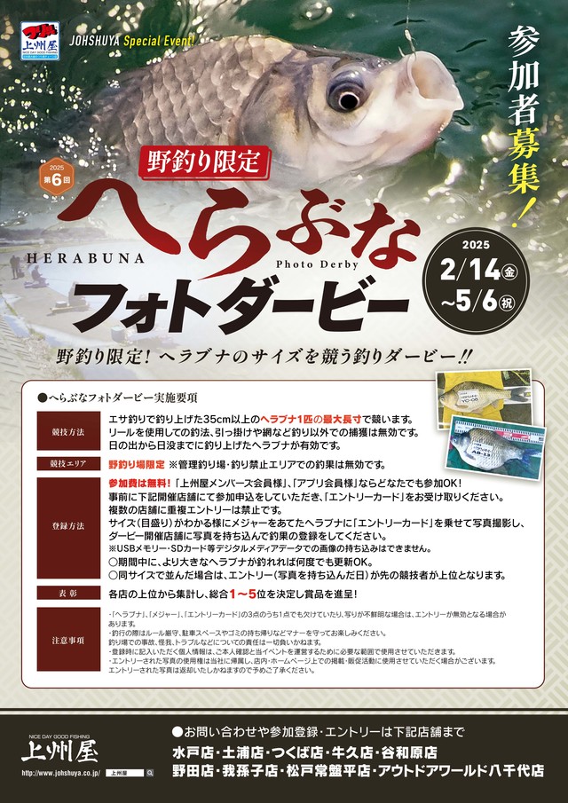 エサ釣りで釣った35cm以上のヘラブナの写真で競います。参加費無料・上州屋メンバーズ会員の方ならどなたでもご参加いただけます。