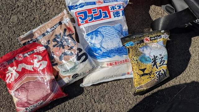一緒に行った父親はエサをマルキューの野釣りグルテンダントツを使用。