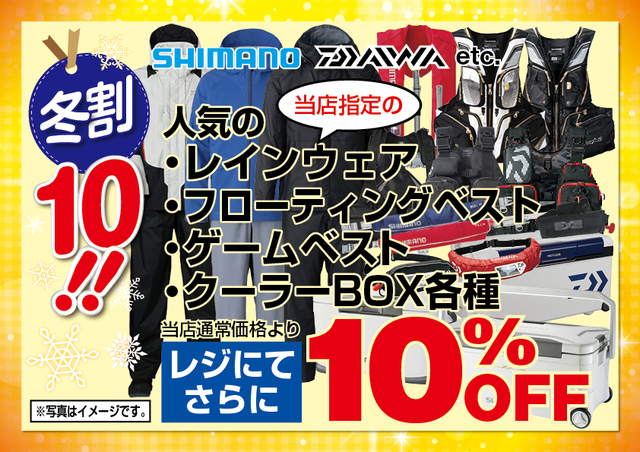 当店指定のロッドやリール、レインウェアにフローティングベスト、