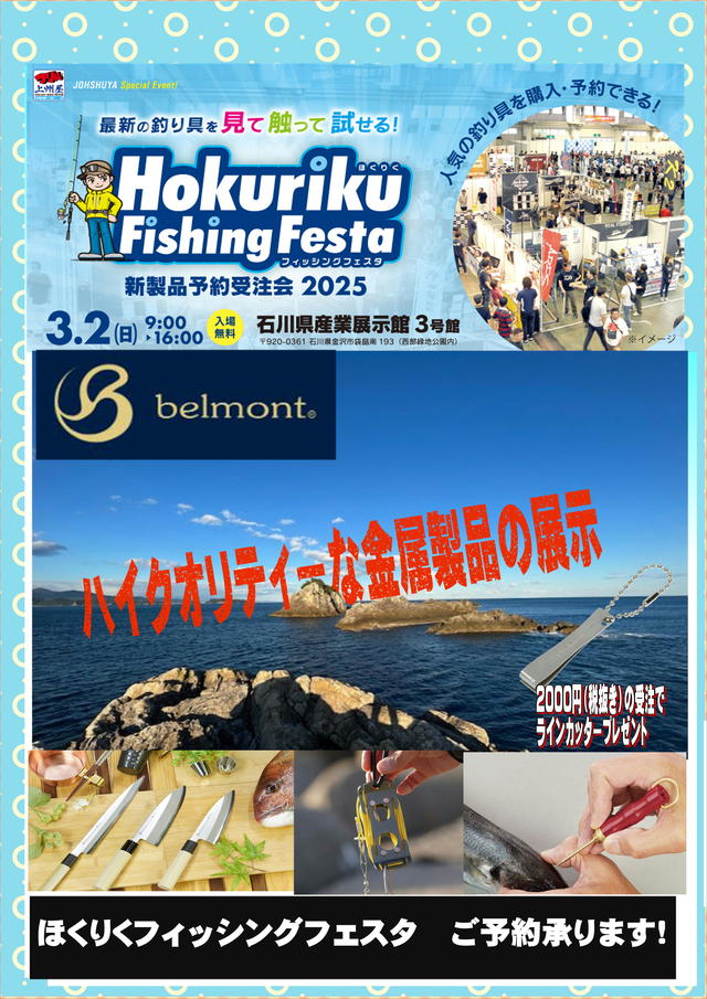 ご好評頂いております【ほくりくフィッシングフェスタ】今年も、石川県産業展示館3号館にて3月2日(日)開催させて頂きます。本日よりご出展頂きます沢山のメーカーのご紹介を毎日更新してまいりますので、是非当店ホームページやインスタグラム、上州屋携帯アプリをご覧ください。