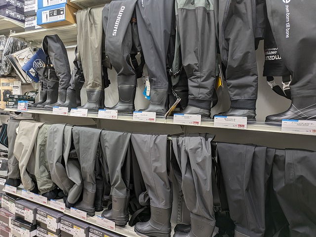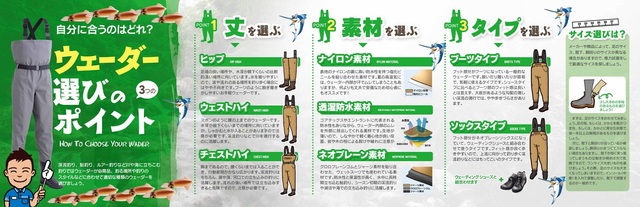 ウェーダーには、胸までのチェストハイタイプ、腰までのウエストタイプ、股下までのピップタイプがあります。