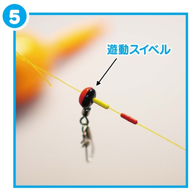 ⑤ 2個目のウキ止めゴム(黄)に続き、遊動スイベルも通します。