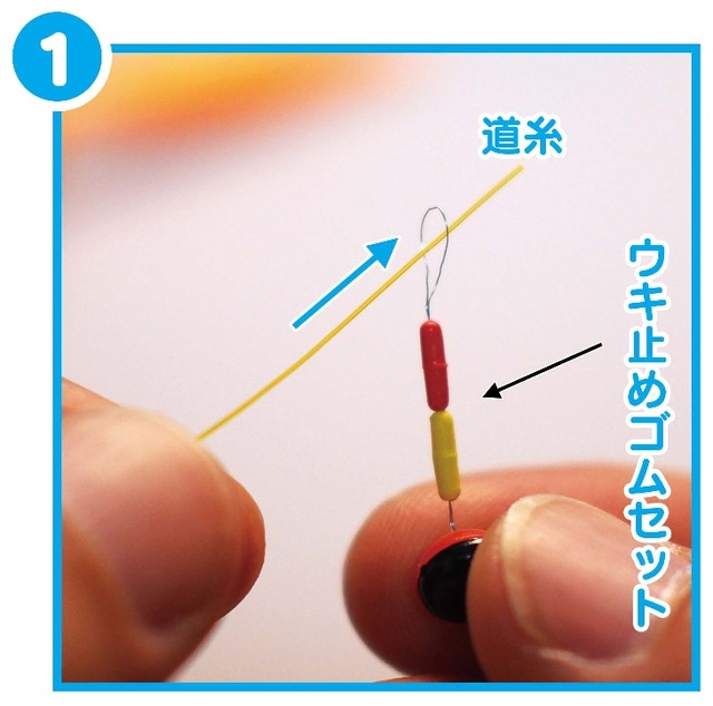 ① ウキ止めゴムセットのワイヤーに道糸を通します。