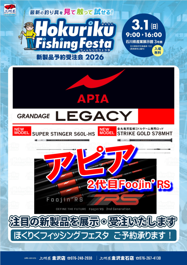 当店では今回入荷したスピングモデルだけでなくベイトモデルも豊富に取り揃えております。「Foojin’RS」シリーズが気になるお客様は是非上州屋小松店までお越しください!