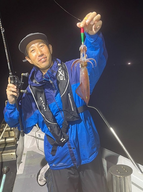 21時ぐらいから様々な棚で船中ヒットする中でもなかなかヒットしませんでしたが、様々な棚であたっていましたので、底からのシャクリ上げの誘いに切り替えた所、まず、浅棚でスルメイカがヒット。続いて、底の軽いシャクリでステイしているとアカイカがヒットしてくれました。