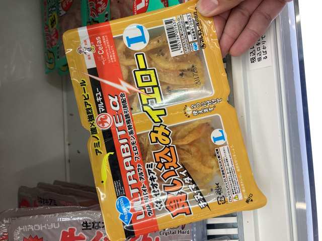 主にチヌ・マダイに適したLサイズのくわせオキアミ!最大の特徴はイエロー×アミノ酸×『ウルトラバイト・アルファ』のトリプルパワーでアピール力、摂餌力をさらにアップ!!また不凍加工を施し、身がしっかりしているのでハリ付けしやすく誰でも簡単に使うことができるので是非お試しください!!