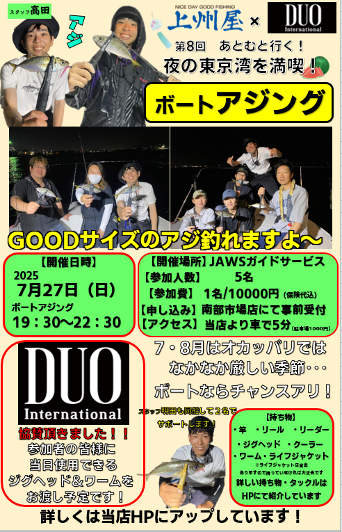今回は当店ルアー担当のスタッフ明田も一緒に乗船してサポートいたします!