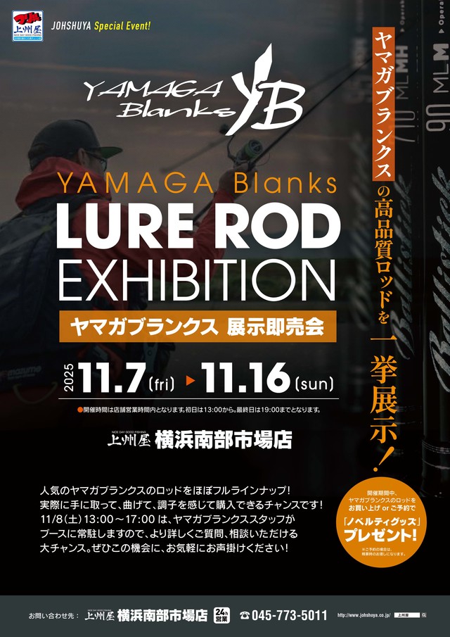 2025年11月7日(金)~16日(日)の10日間、上州屋横浜南部市場店にてヤマガブランクス、ルアーロッドの展示受注会を開催します!
