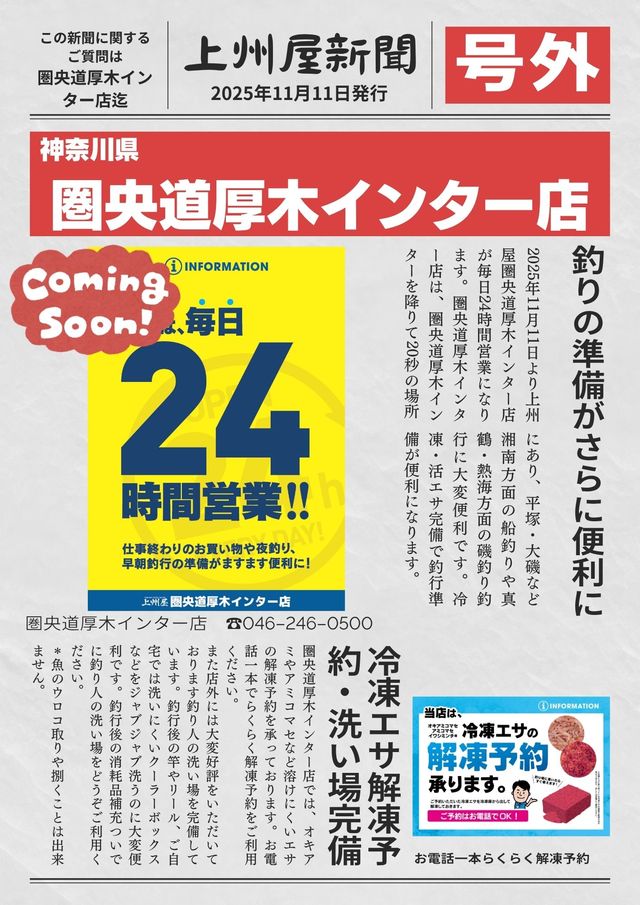 神奈川県内の上州屋24時間営業店舗が11/11(火)より増えます!