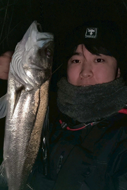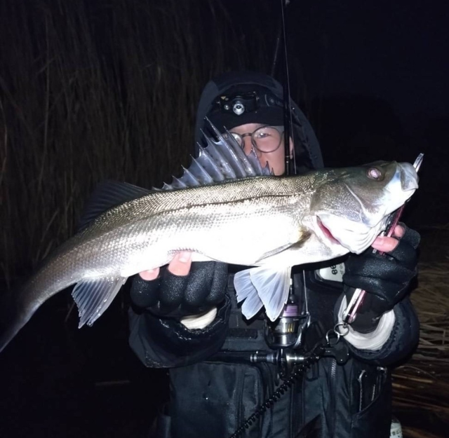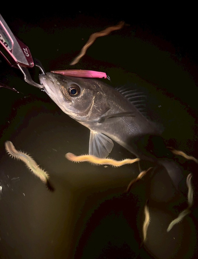 釣れたシーバスとルアーの写真に漂うバチの姿を…!