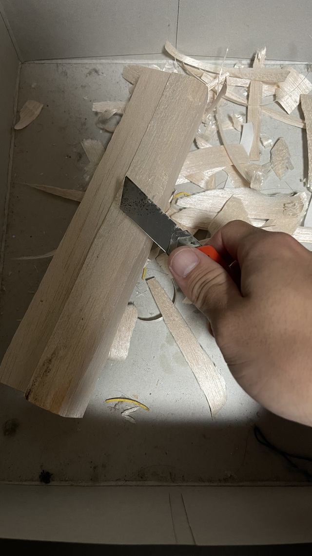 カッターで削って自分の作りたいルアーの形を出していきます。