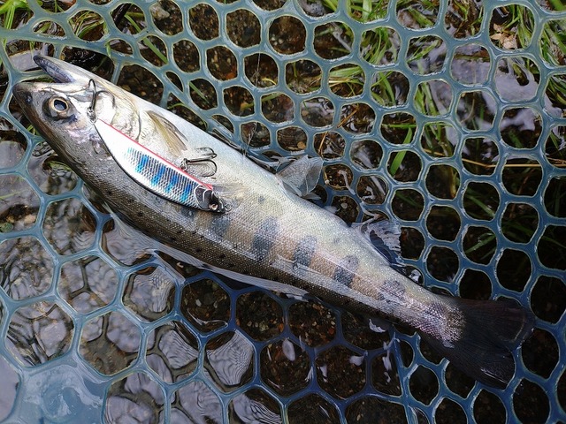 午後はやや上流を探るも全く気配無し(真っ昼間だからか、魚影そのものが薄いのかは不明)で、夜勤から寝ていないので最下流で手堅く釣って帰ろうとしていたら・・・・。
