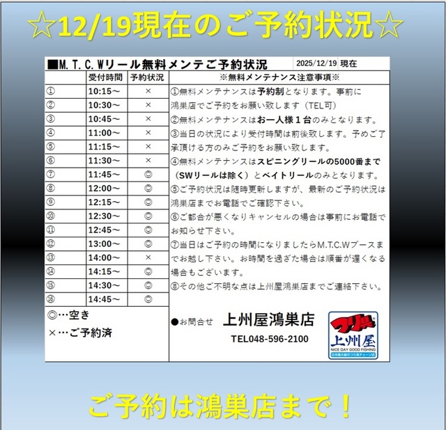 ⑤ご予約状況は随時更新しますが、最新のご予約状況は鴻巣店までお電話でご確認下さい。