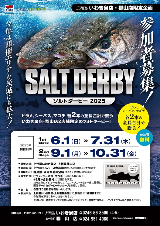 2025年7月8日セール・イベント 7/7ソルトダービー釣果報告 出典: 出典: 出典: 参加者募集中! 出典: 参加はシーズン途中でもOKですので、参加ご希望の方は郡山店・いわき泉店で申し込みをお願いします。(参加費無料) 出典: ご協賛メーカー様。ありがとうございます! 上州屋からのお知らせ ・会員証機能を搭載!お買い物や釣りの準備がもっと便利になる上州屋“公式”アプリ登場!・【上州屋メンバーズカード】毎月5の付く日と30日(5日、15日、25日、30日)はポイントアップデー!
