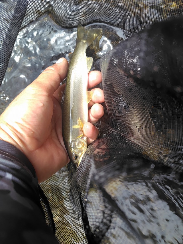 下流のポイントへ行こうと移動中に鮎がギラギラ昇っているのを見つけ、下流からソッとルアーを近づけてステイさせているとギューン!3尾目。