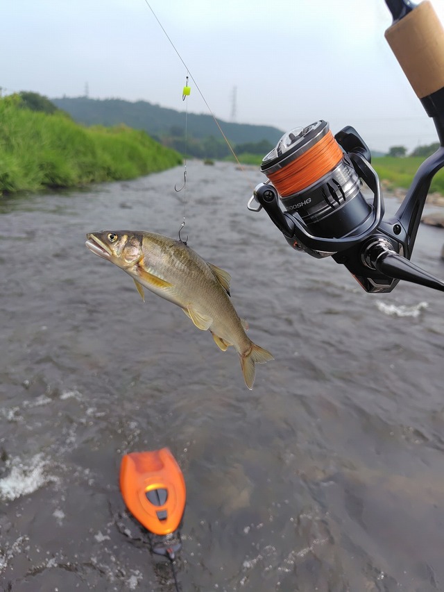 早々に準備して水遊びの方よりも上流の瀬で釣り開始の1投目からギューン!と1尾目。写真を撮って2投目、同じ場所へルアーを送るとギューン!と2尾目。
