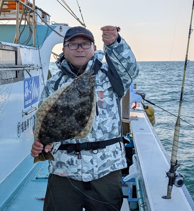開始後すぐに船中でヒラメが釣り上がる中、ケイゾー氏に待望のヒット!