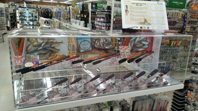 ダイワ・宇崎日新の竿に加えて、今年、リニューアルして販売されたティムコ「幸釣」シリーズも展示。