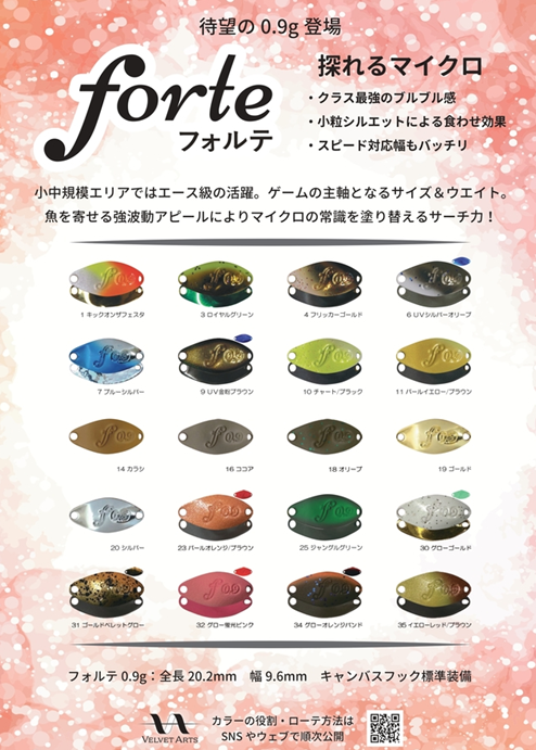 2025年1月9日おすすめ商品 ベルベットアーツ フォルテ0.9g 1月10日より販売♪ ベルベットアーツより人気のフォルテ0.9g久しぶりの入荷です!(^^)!全色ございますのでご来店お待ちしています♪ 出典: 上州屋からのお知らせ ・会員証機能を搭載!お買い物や釣りの準備がもっと便利になる上州屋“公式”アプリ登場!・【上州屋メンバーズカード】毎月5の付く日と30日(5日、15日、25日、30日)はポイントアップデー!