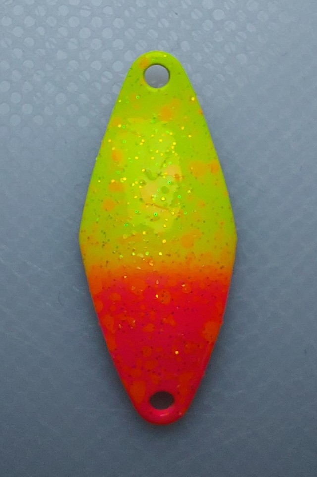 表面はオレンジテール+イエローとピンクのスプラッシュがマスにとって強いアピール、加えて裏面のこげ茶が強い明滅を生み出すことでなかなか口を使わないマスにリアクションバイトを誘発します(^^♪