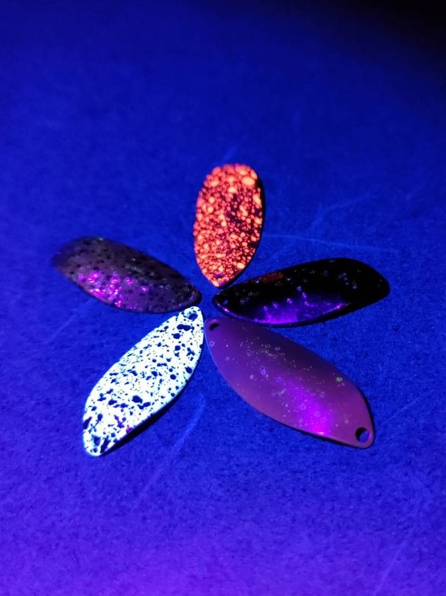 カラシ色にブルーパールを塗り、オーロラのラメには蛍光イエローとグリーングローに発光する隠し味が入っている集魚力を高めたカラー。