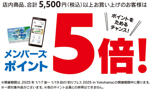 2025年1月17日(金)、18日(土)、19日(日)の3日間限定!上州屋各店でのお会計時に「釣りフェス2025のチケット(半券・電子チケット)」をご提示いただくと、店内商品合計5,500円(税込)以上お買い上げでメンバーズポイント5倍!