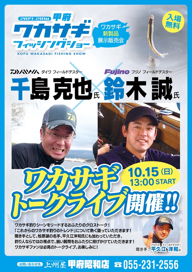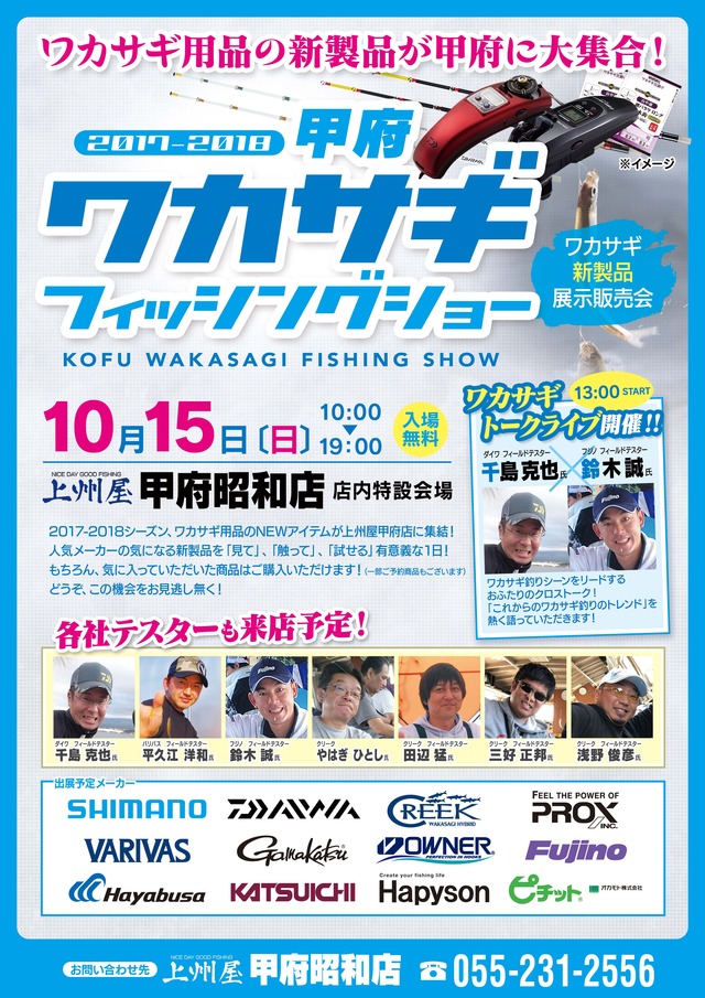 10月15日に当店にて開催の「甲府ワカサギフィッシングショー」当日のスケジュール並びに参加メーカー様の再度のご案内です。