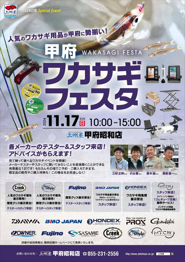 11/17(日)開催の甲府ワカサギフェスタにてC-Styleブースにてはアドバイザーの小山響氏に常駐頂き