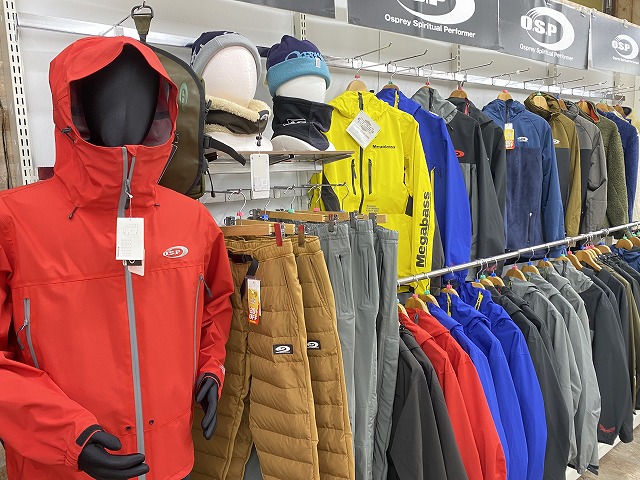 階段上がって正面、ルアーメーカーのアパレルが並びます♪
