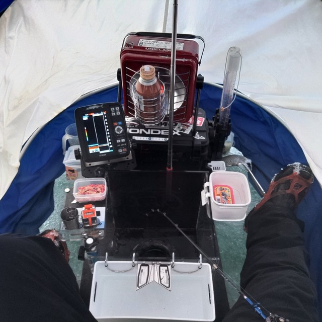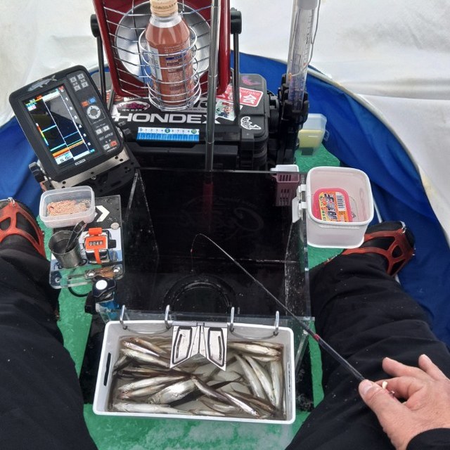氷上釣りは穂先がスンと動き、あわせるとギュンと入る「乗った感」が楽しく、これが始まるとワクワクしちゃいますネ♪