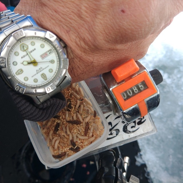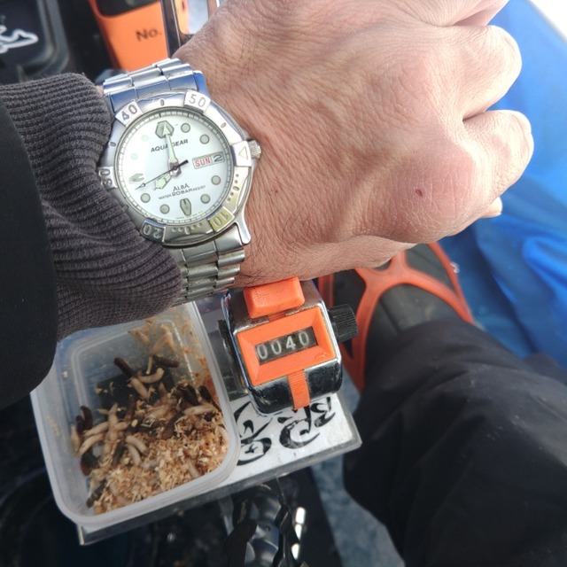 7時20分スタートの40分くらいで40匹まで到達。エサは白サシと紅サシを使用しましたが、紅が圧倒的だったのですぐさまオール紅サシにチェンジ。