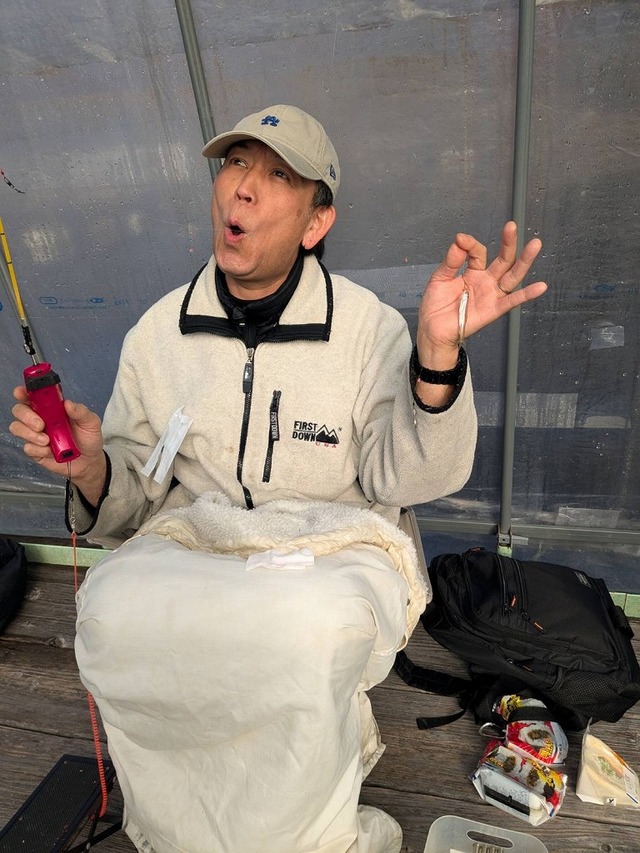 バスマンでこの日初めてワカサギ釣りにチャレンジの珈琲館のマスターは、すぐにアタリを取って釣るコツをつかんでご満悦。