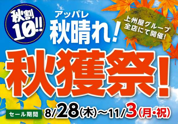 最高1等20,000円分のショッピングクーポン券が当たるチャンス!9月24日(水)より店内商品1回のお支払い金額3,300円(税込)以上お買い上げで、下記「第2弾“秋獲祭”大抽選会」に参加できる抽選券を1枚プレゼント!買えば買うほどチャンスもアップ!