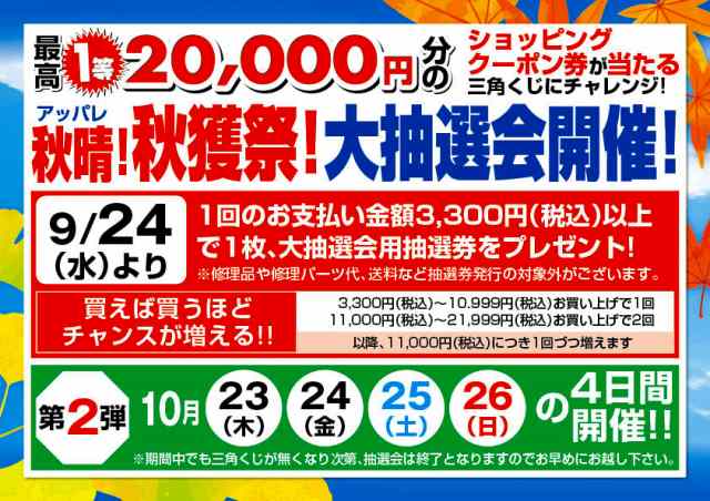 ※抽選券(抽選回数)は税込3,300円以上~10,999円のお買い上げで1枚(1回)、以降11,000円につき1枚(1回)づつ増えます!※修理代金や修理パーツ代、送料などのお支払いは抽選券発行の対象外となります。※開催期間中でも三角くじがなくなり次第、抽選会は終了となります。期間中はお早目のご来店をお願い申し上げます。