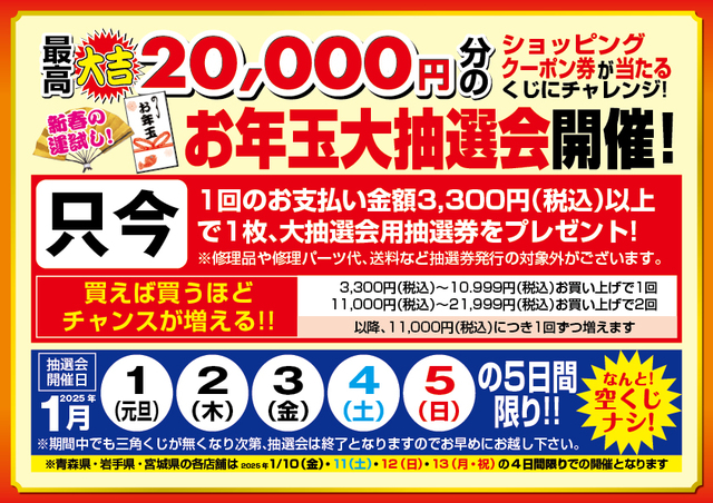 2025年1月1日(元旦)、2日(木)、3日(金)、4日(土)、5日(日)の5日間限定(※注)、最高『大吉』20,000円分のショッピングクーポン券が当たる“お年玉”大抽選会を開催します!なんと空クジなし!開催期間中、上記案内の抽選券をご持参、もしくは1回のお支払い金額3,300円(税込)以上でその場でチャレンジ!