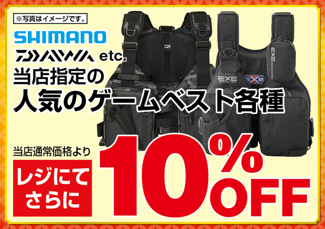 冬割10!!セール期間中、シマノ、ダイワetc.当店指定のゲームベスト各種が当店通常価格よりレジにてさらに10%OFF!