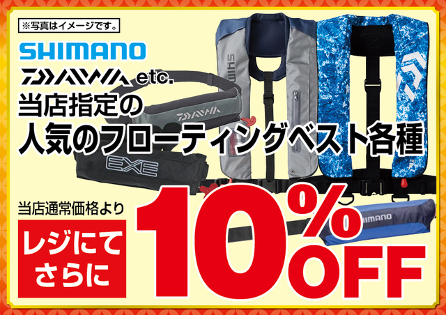 冬割10!!セール期間中、シマノ、ダイワetc.当店指定のフローティングベスト各種が当店通常価格よりレジにてさらに10%OFF!