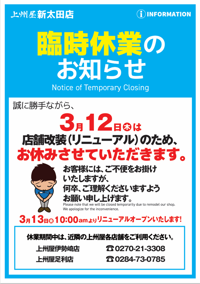 【新太田店】店舗改装によ3/12(木)臨時休業および3/13(金)リニューアルオープンのお知らせ。