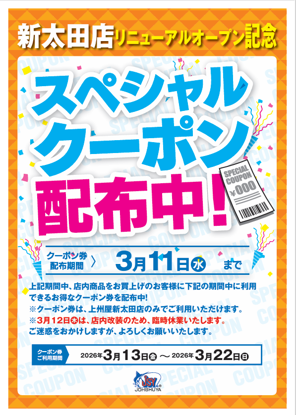 只今、上州屋新太田店では店内商品お買い上げのお客様に同店リニューアルオープン後(3月13日~3月22日)にご利用いただけるスペシャルクーポン配布中!