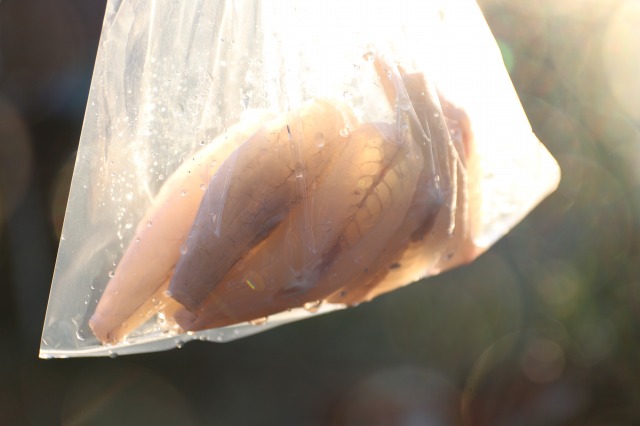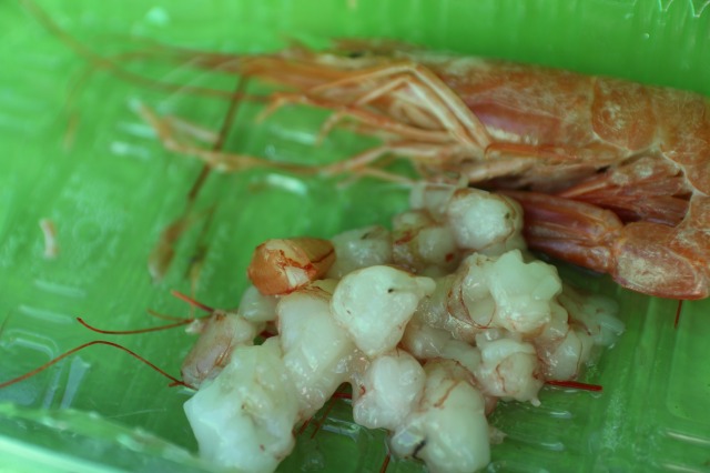 エサはアルゼンチン赤エビのお腹の部分をむき身にして使うのですが、エビみそが詰まった頭部を捨てるのがもったいない・・・