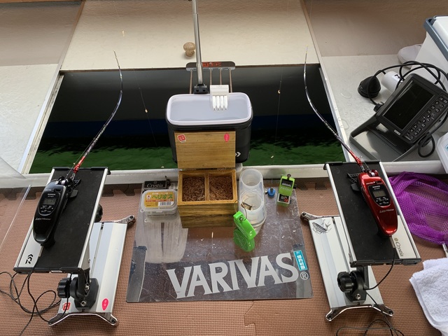 ポイントに着くまでに仕掛をセットし、準備を済ませます。(花屋さん乗船時の写真です)