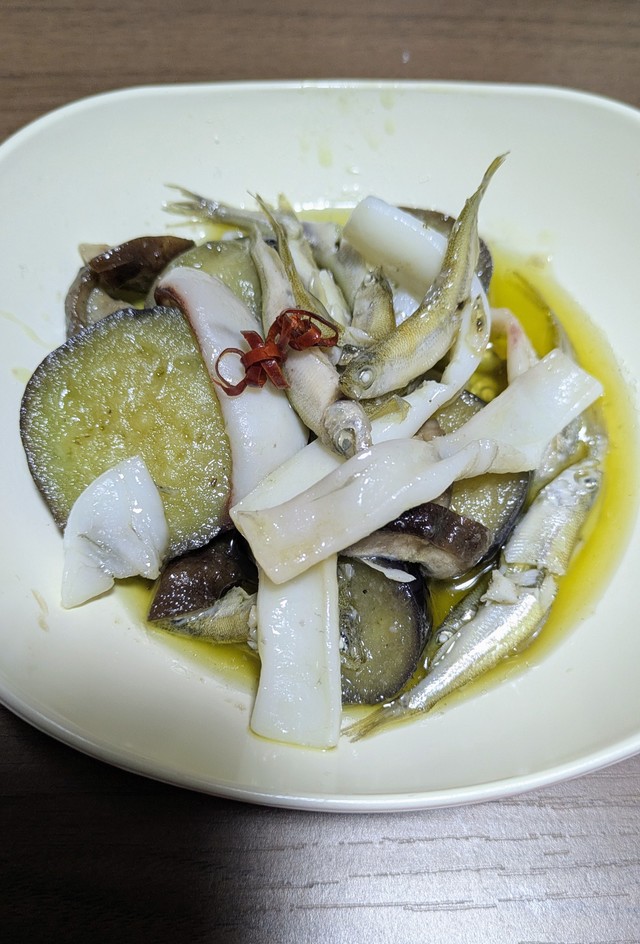前回釣れたワカサギが冷凍庫に当然ながら残っていたので大量消費をするためにヤリイカと合わせてアヒージョを作りました。