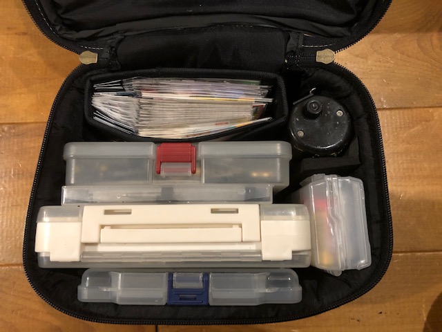 仕掛・オモリ・下針ケース・電池・カウンター・ハサミなどを押し込んでます。