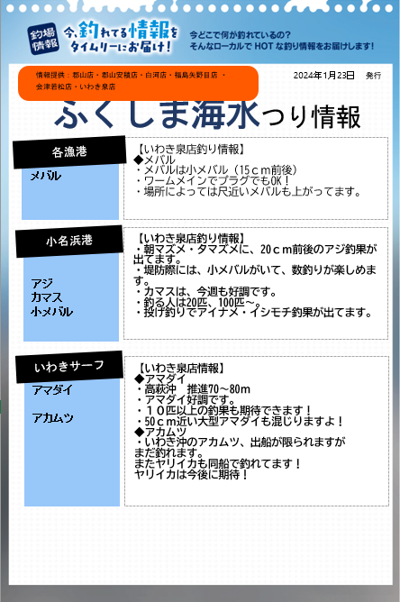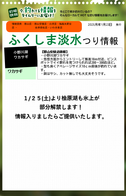 2025年1月25日その他・お知らせ 福島釣り情報 福島県内の最新釣り情報(1/23) 出典: 出典: 上州屋からのお知らせ ・会員証機能を搭載!お買い物や釣りの準備がもっと便利になる上州屋“公式”アプリ登場!・【上州屋メンバーズカード】毎月5の付く日と30日(5日、15日、25日、30日)はポイントアップデー!