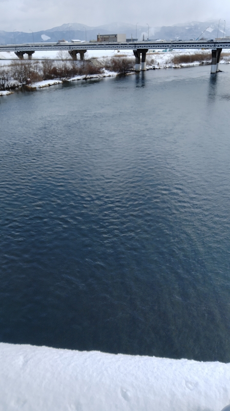 今回の寒気で堤防上の道路や川に降りる所は積雪しています。
