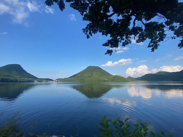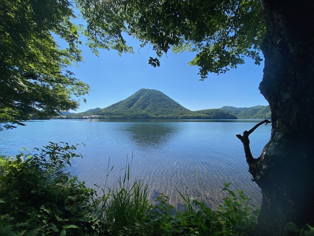 湖畔にそびえる榛名富士(標高1,391m)は、富士山のような美しい山。