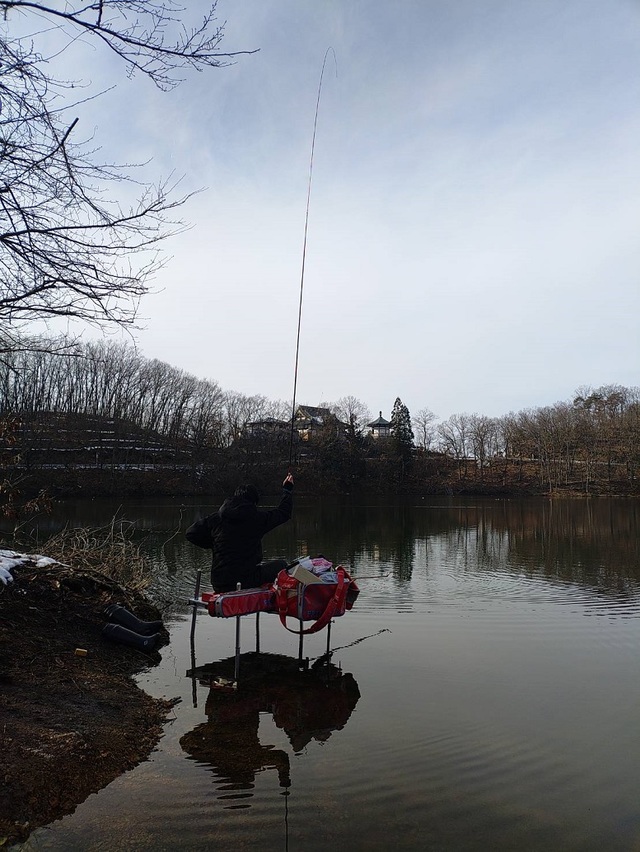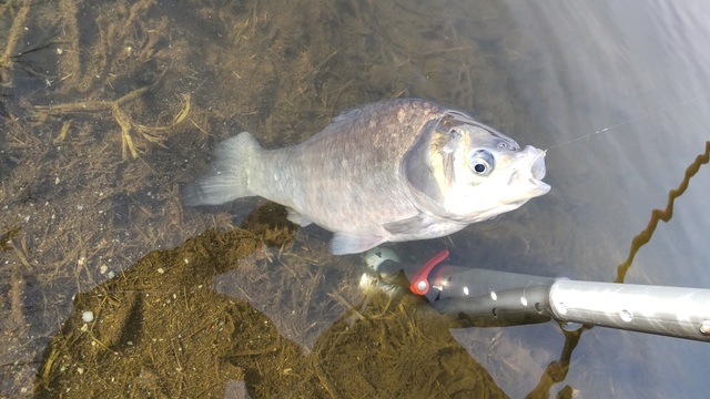 12時も過ぎる頃に明確なアタリで一枚を釣りますがそれ以降もその前も魚は寄っていないようです。毎日エサを打っている場所とたまにしか打たない場所では魚の寄りも違うようで。当日も2時30分頃まで竿を出すも一つで終了。裏側のSさんは(=_=)