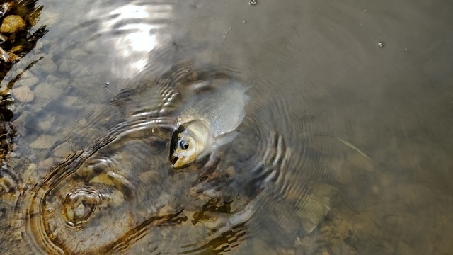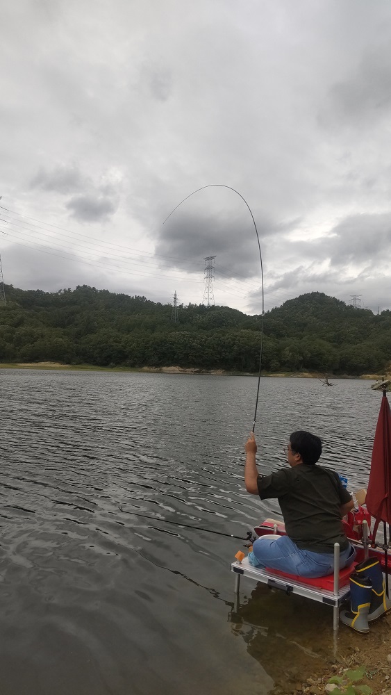 13尺の2本の宙釣りに切り替えます。先にエサ打ちしていたSさんはブルーギル5連チャン。へら鮒のアタリもあるのに食いが悪い前川ダムのようです。