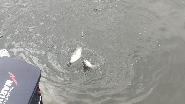 結局2時くらいまで竿を出してましたが朝イチ以外は雨も降らずちょっとした風に悩まされたくらいで楽しい釣行となりました。当日は11時くらいから喰いが立ってきてブルーギルの群れもそこで収まりました。